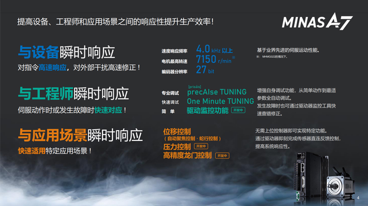 伺服智能化優(yōu)化人機(jī)作業(yè),智能化伺服可通過自動(dòng)調(diào)試功能、擴(kuò)展維護(hù)功能和應(yīng)用優(yōu)化功能等可輕松實(shí)現(xiàn)過去需要開發(fā)工時(shí)的調(diào)試。提高人員、機(jī)器和應(yīng)用程序的響應(yīng)能力,并有助于提高生產(chǎn)力。